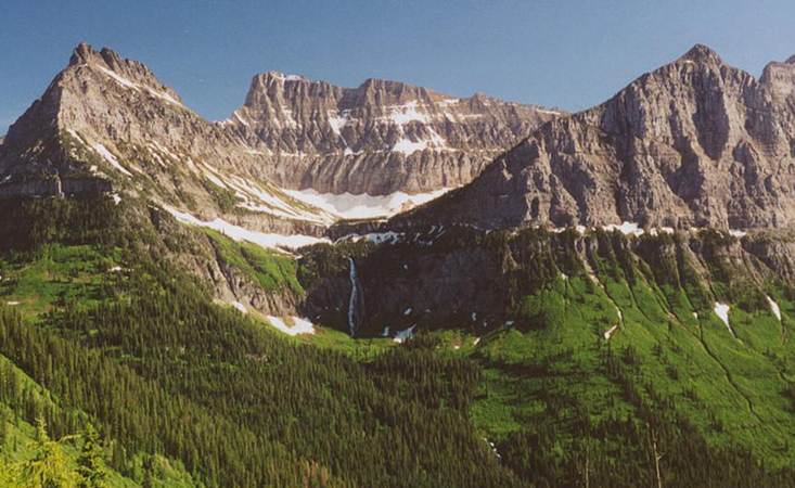 Cirque and hanging valley and waterfall in Glacier National Park. Note the U-shaped valley of the cirque. Notice the aretes (knife-like ridges at the margins of the cirque).