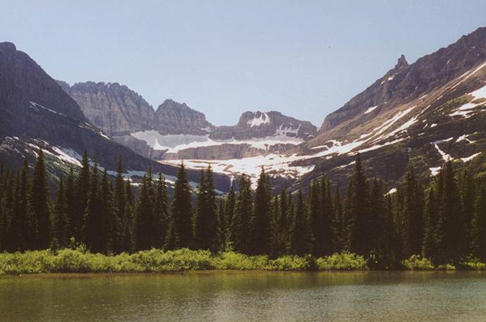 Grinnell Glacier & diorite sill (above & below) - the Grinnell Glacier terminates in a small lake. The rock wall behind Grinnell Glacier has sedimentary rocks of the Belt Supergroup intruded by a diorite sill. The whitish zone above & below the diorite sill is a bleached zone, the result of contact metamorphism.