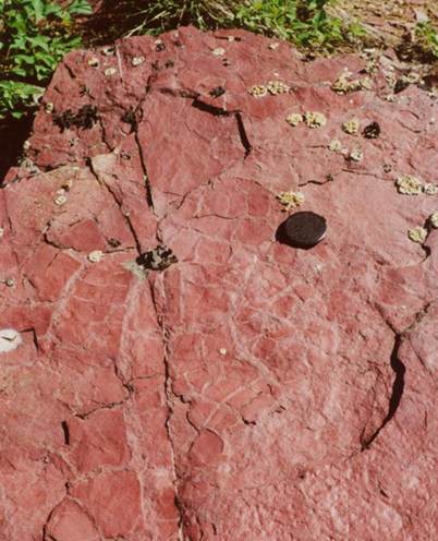 Mudcracks preserved in reddish, hematite-rich argillite (slightly metamorphosed shale) of the Grinnell Formation (Belt Supergroup, Proterozoic). Mudcracks form under alternating wet and dry conditions.