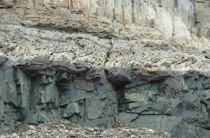Diorite sill (dark rock at bottom) intruding Belt Supergroup sedimentary rocks at Big Drift roadcut along Going-to-the-Sun Highway.