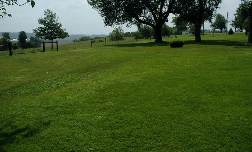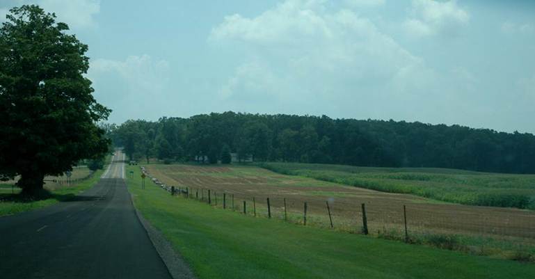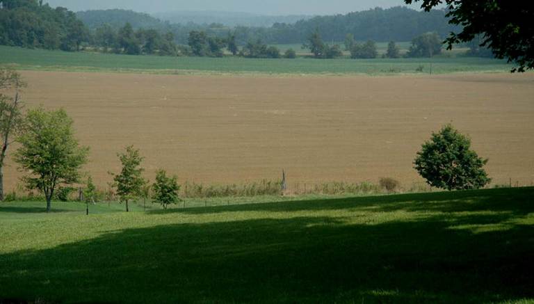 Above: Looking ~SE. Ohio Caverns occurs directly below the land surface here. The small whitish building behind the two tall trees is the cave exit house.
