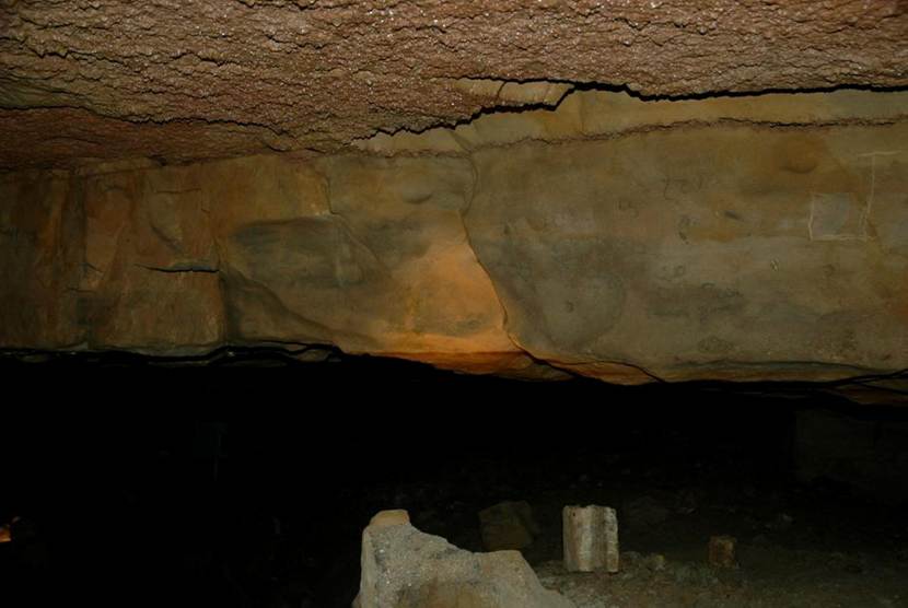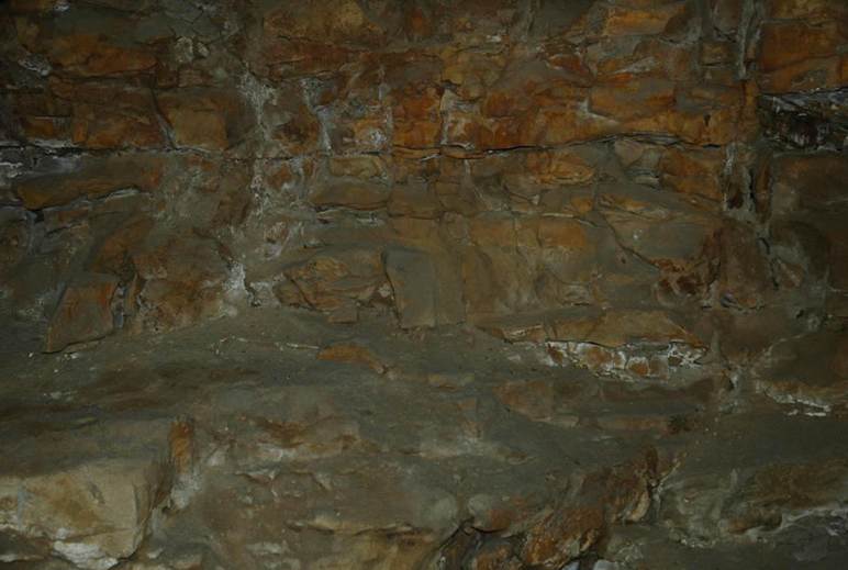Above: The cave ceiling here is a stylolite surface. Stylolites represent surfaces of weakness. At Ohio Caverns, stylolites often define the upper separation planes for collapsed limestone blocks.
