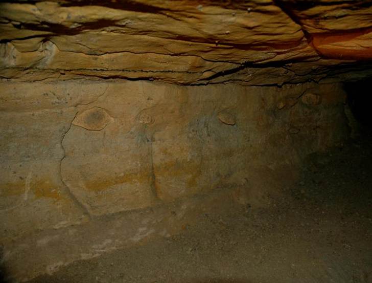 Above: Wall & ceiling of Ohio Caverns showing bedding nature of the Columbus Limestone. The subrounded to eye-shaped structures along the wall are chert nodules.