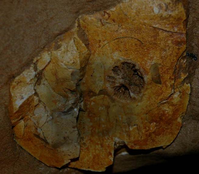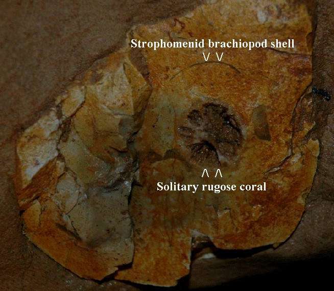 Above & below: a fossiliferous chert nodule with an obvious strophomenid brachiopod shell cross-section & a large solitary rugose coral.