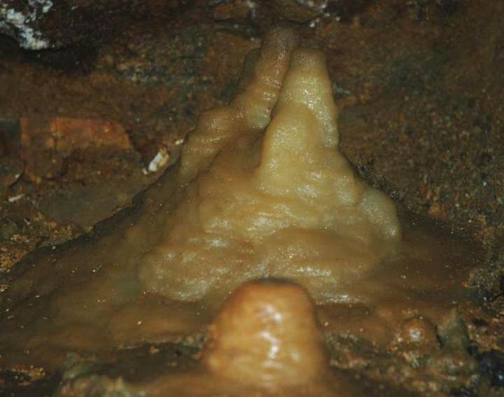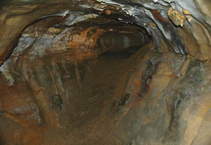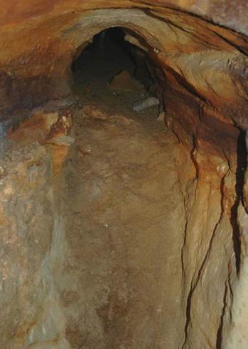 Much of the passage system in Ohio Caverns was filled with muddy sediments when first discovered in the late 1890s. Some of the smaller side passages still have muddy sediment fills (see pics below).