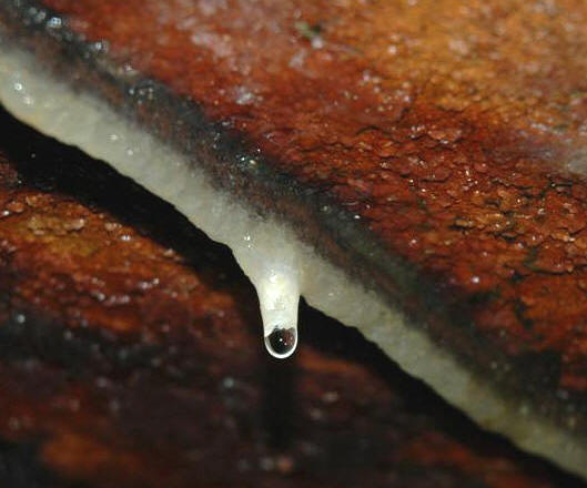 Once downward percolating groundwater reaches the ceiling of a subterranean cavity, the water encounters air with a lower partial pressure of carbon dioxide gas. The two chemical equations given above then shift to the left, and calcite precipitates. Most people think that the calcite precipitates as water evaporates. Well, most caves are quite humid (cave air is close to being water saturated), so the water isn't evaporating. The calcite in stalactites & other speleothems gets precipitated as a result of a CO2 partial pressure change.