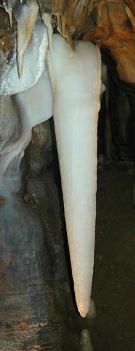 Crystal King Stalactite, the largest known in Ohio Caverns. It's just shy of being five feet long. It is composed of nice, white travertine.