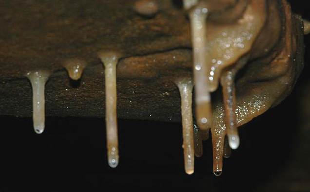 Soda straws are narrow, cylindrical stalactites. Ohio Caverns has some well developed soda straws, although many are broken. Some of them are thicker than typical soda straws, and are slightly tapering, rather than cylindrical.