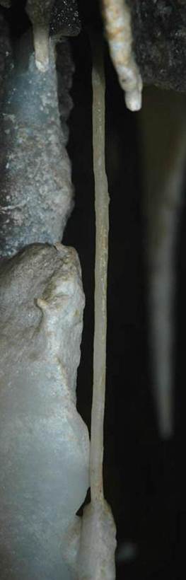 Above: a long soda straw with a stalactite at its distal (bottom) end.