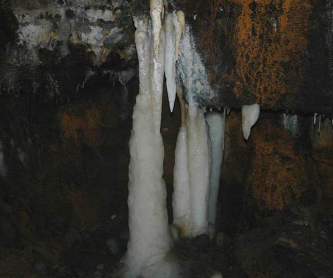 Stalactites are mineral icicles hanging down from cave ceilings. They are one of many varieties of speleothem, the general term for all secondary cave mineral deposits. Speleothem that forms by dripping water is called dripstone. Stalactites and their equivalents on cave floors - stalagmites - are the most common & easily recognizable forms of dripstone.