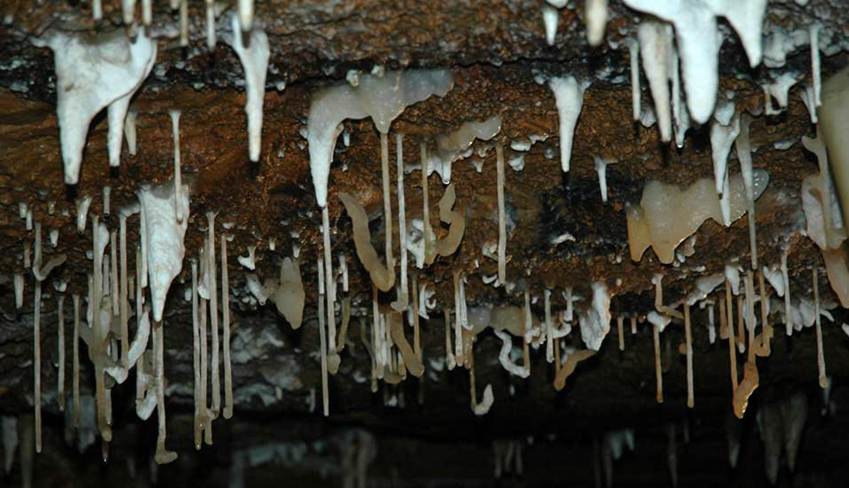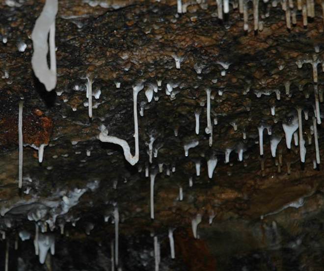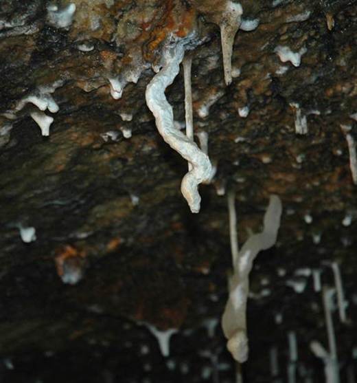 Helictites are twisted, contorted speleothems growing from cave walls & ceilings that appear to defy gravity. They do not form by dripping water, as stalactites & stalagmites do, nor by flowing water, as flowstones do. Helictites form principally as a result of water moving by hydrostatic pressure & capillarity. Hydrostatic pressure pushes water from pores in a cave wall, and a CO2 partial pressure change results in calcite precipitation. A small calcite protrusion is now present on a cave wall. Capillary action draws additional water sideways through the protrusion, and more calcite precipitation occurs. The spiralling, twisting, and bifurcation seen in many helictites is caused by rotation of calcite crystallographic axes during precipitation events and by the presence of impurities in the precipitated material.