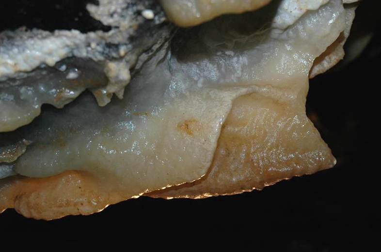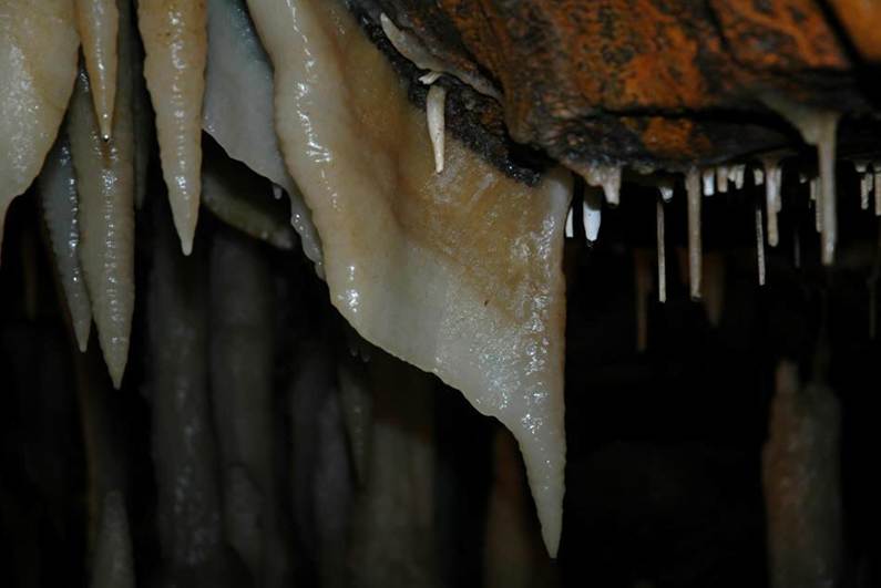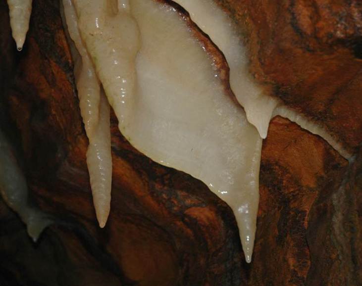 Draperies are planar to subplanar to wrinkled speleothem curtains hanging from the ceilings or inclined walls of caves. They form by calcite precipitation as individual water drops run down inclined surfaces. In many caves, draperies have reddish-brown & whitish color bands parallel to the lower surface. Such strutures are appropriately called "cave bacon" or bacon draperies.