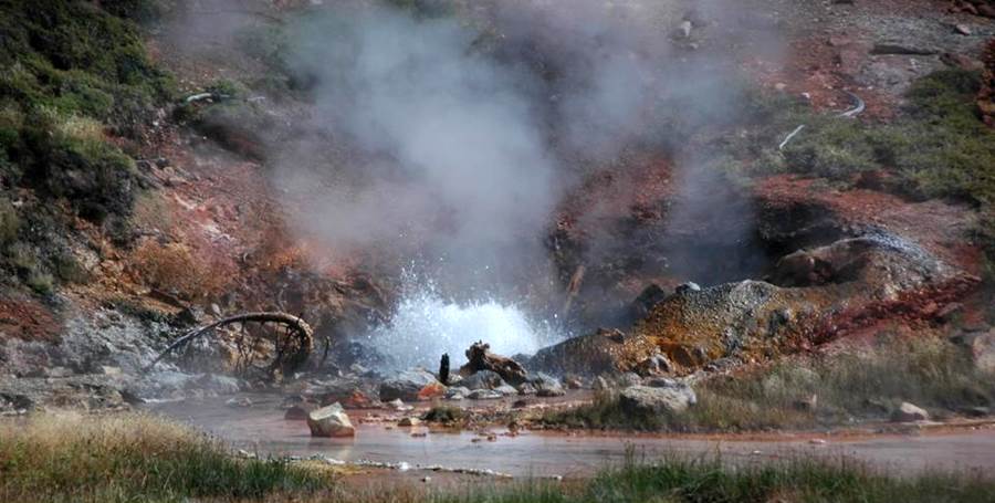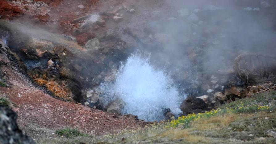 Blood Geyser is surrounded by rubble and hematite (reddish) &