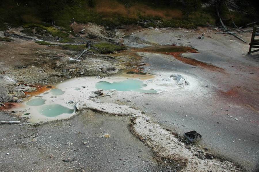 surrounding “Dog Bone Pool” is weathered and altered rhyolite and geyserite,