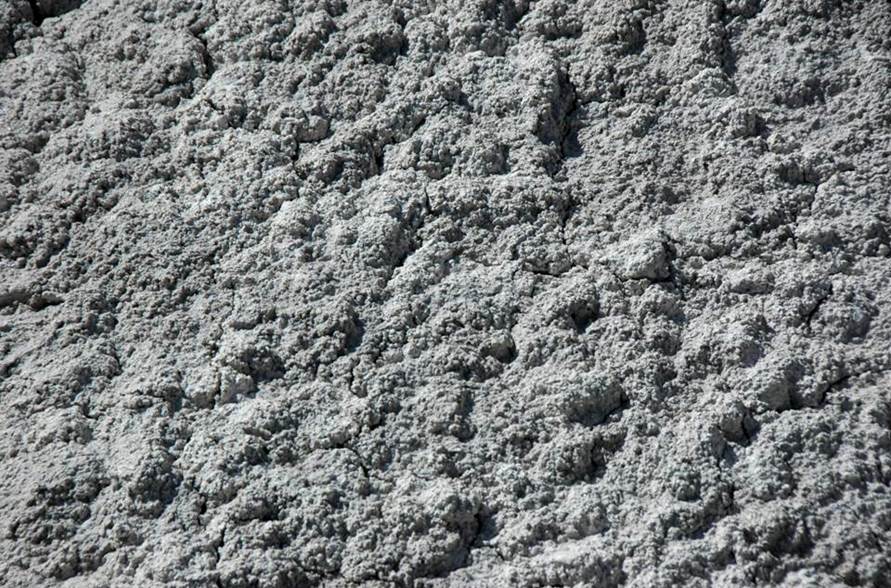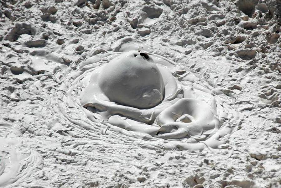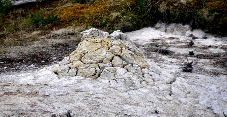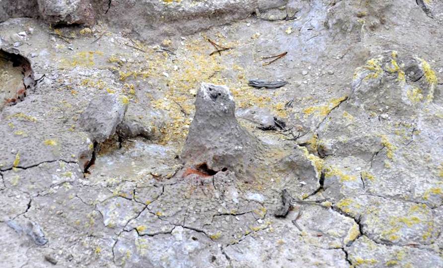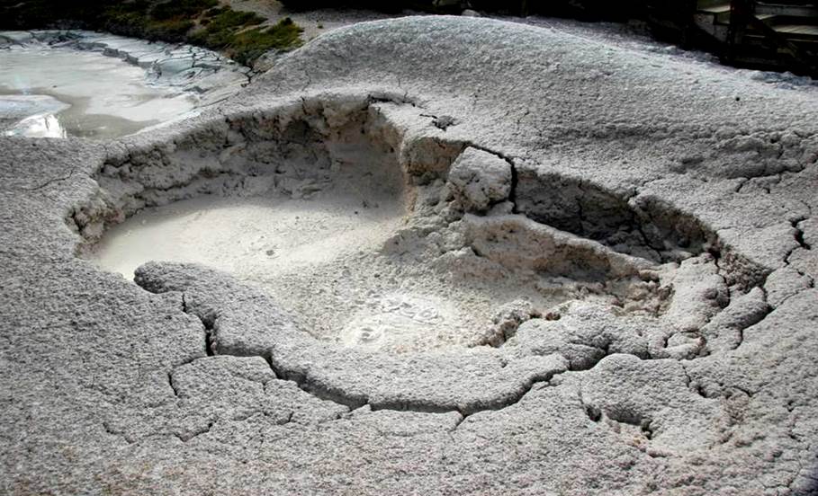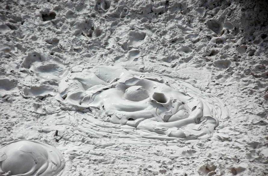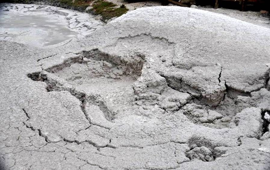 friable, dried mud surrounding active crater of mud pots. Each nodule is a dried blob of mud that was