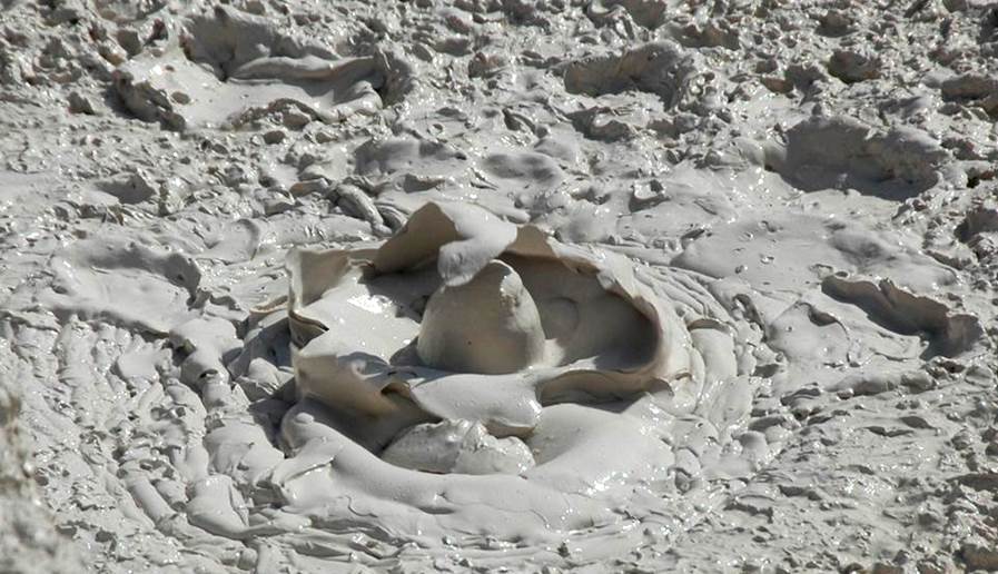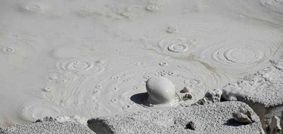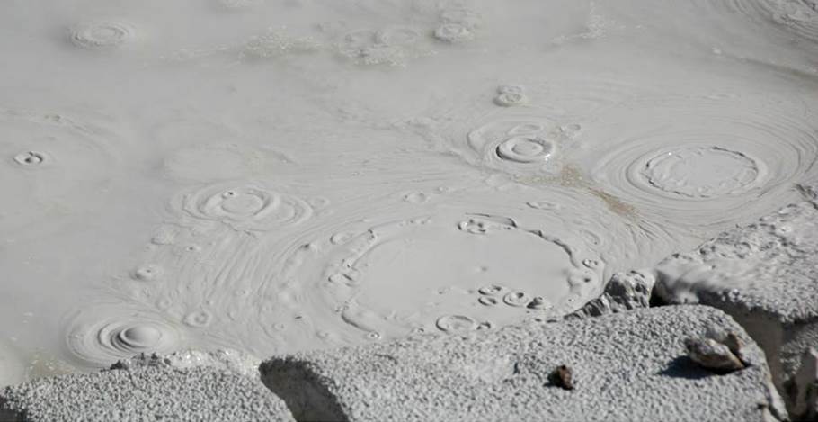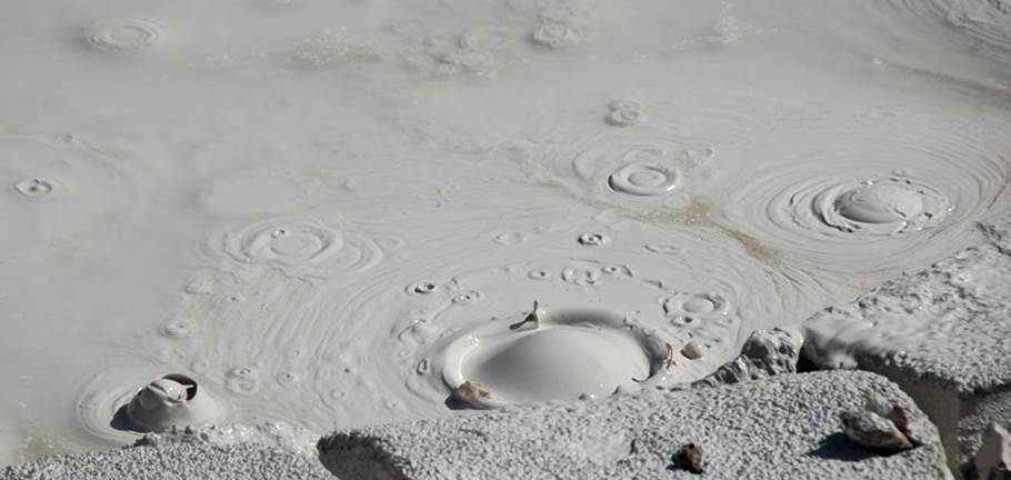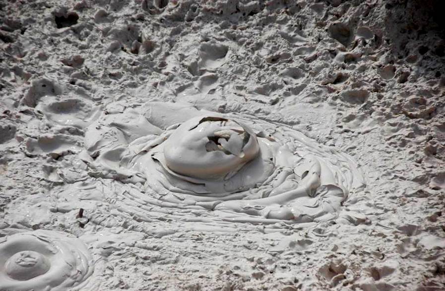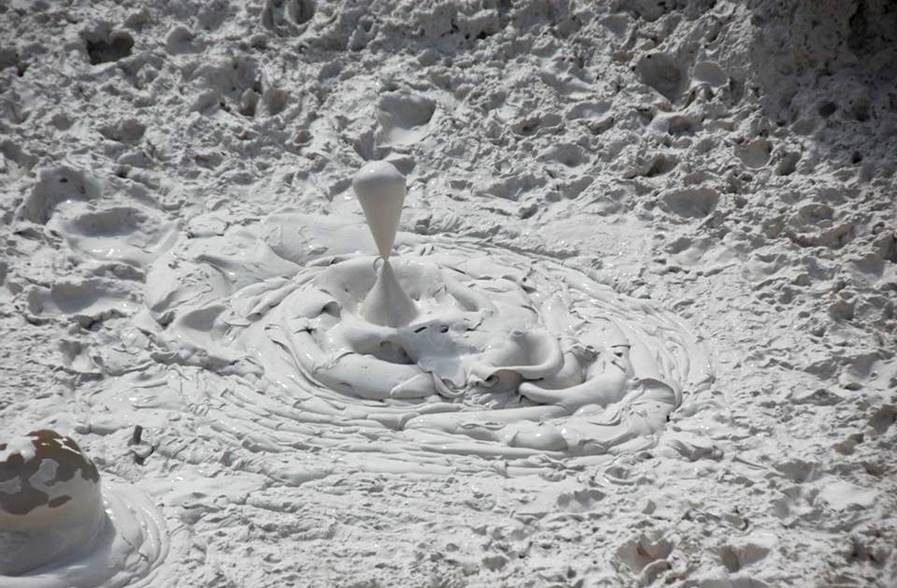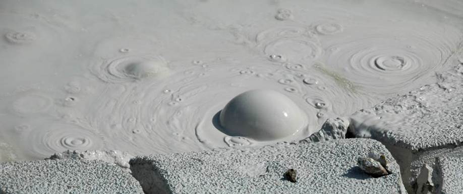 summer, the viscosity of the mud pots increases. Gases reaching the top surface energetically