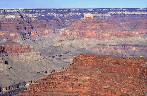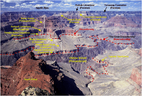 Grand Canyon of the Colorado River (above & below) with the stratigraphy labeled.