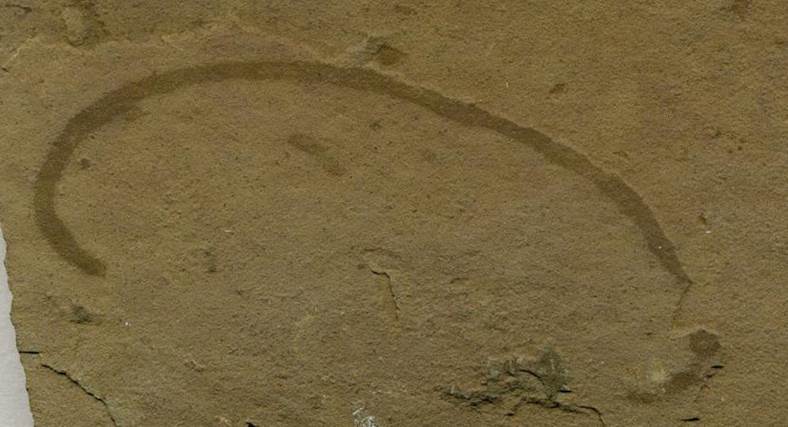 Grypania spiralis ribbon on taconitic mudshale, 2.5 cm across at its