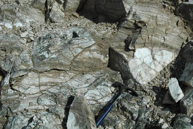 whitish masses above geology hammer) within banded gypsum-calcite rocks of the
