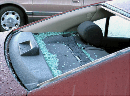 Hailstone damage - broken window on 2nd floor of west-facing side of a