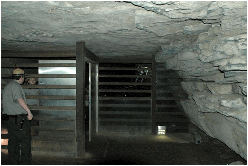 The open spaces between the bars also allow bats to leave & enter the cave. Eight species of bats are known to inhabit Mammoth Cave. Bats were a common sight in Houchins Narrows in the 1800s (and in the Rotunda and Audubon Avenue and Little Bat Avenue, etc.). Bat populations used to number in the millions, but are significantly reduced nowadays.