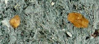 Joaquinite (orangish-brown) on blueschist (glaucophane metamorphite.