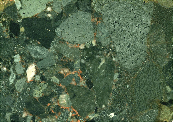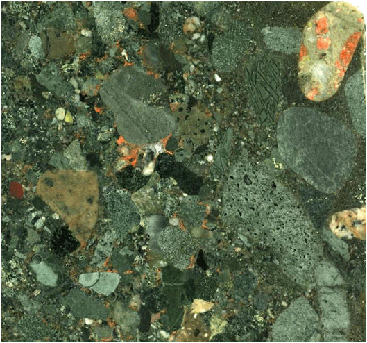Polymict conglomerate (above & below; 6.0 cm across) having pebbles of