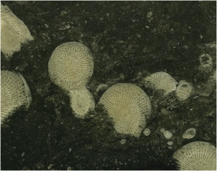 large, light gray-brown colored, rounded objects in the rock are fossil rugose
