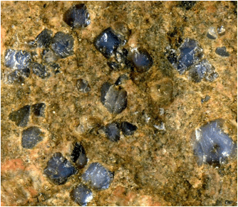 phenocrysts of quartz (dark blue) and perthitic feldspar (light
