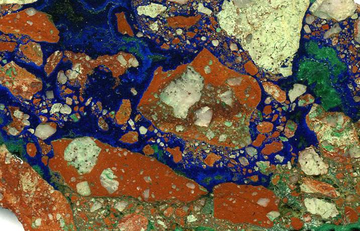 Azurite and malachite (above & below) acting as cement minerals in a