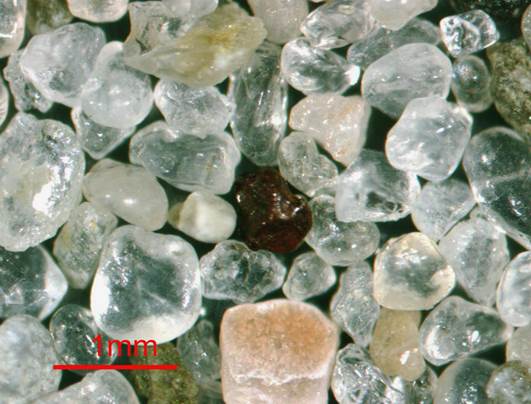 Quartzose marine beach sand (above & below) from sea level at Carrickalinga Head, north of Normanville, northwestern margin of the Fleurieu Peninsula, southeastern shores of Gulf St. Vincent, southern Australia (microphotograph by Sara Beth Kopczynski).