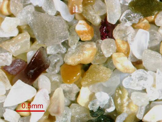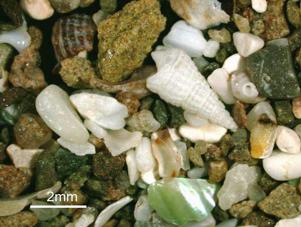quartz grains, variably-colored and abraded mollusc shell fragments, and some
