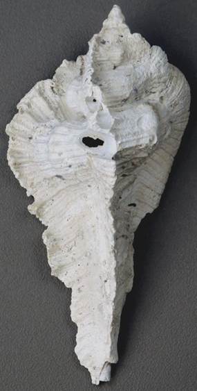 Phyllonotus fossil muricid snail shell (5.8 cm tall) - abapertural view (left)