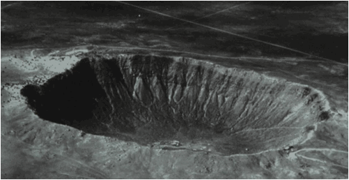 The crater shown above in the Arizona desert was formed by the impact of an octahedrite ~49,000 years ago during the Late Pleistocene. The rocks shown below are fragments of the impactor, the Canyon Diablo Meteorite. Such fragments have been collected for decades from the desert surrounding the crater.