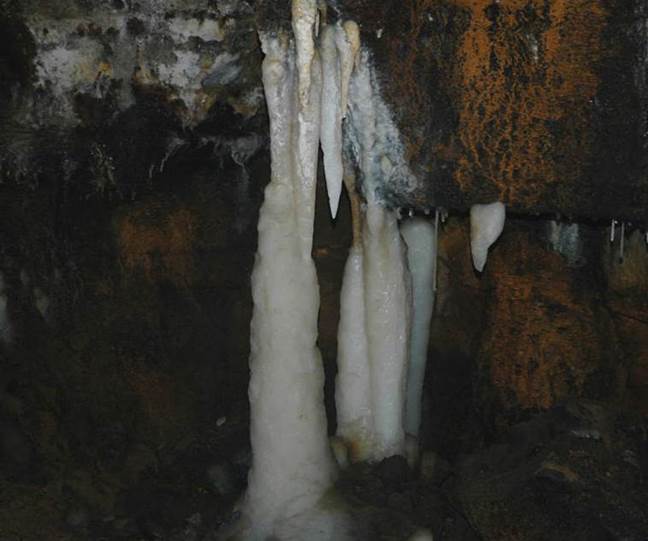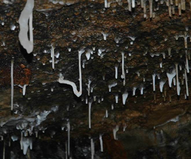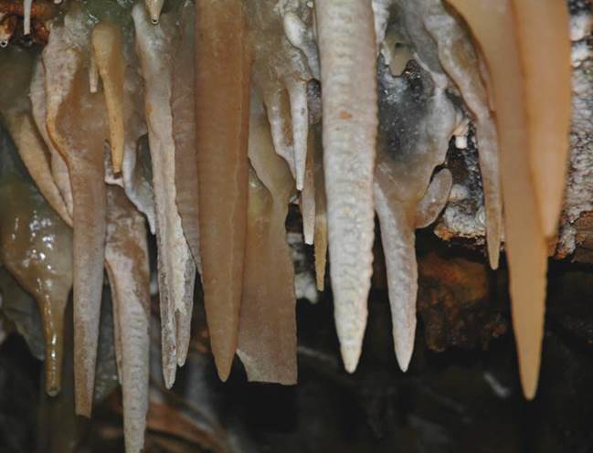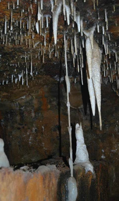 the cave ceiling and small stalagmites on the cave floor. Quickly