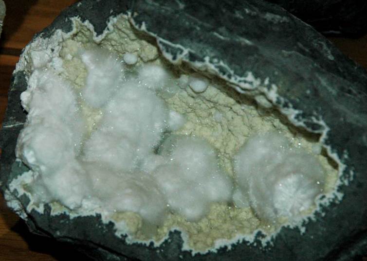 cavities in some basalt lava flows. It forms whitish-colored tufts or
