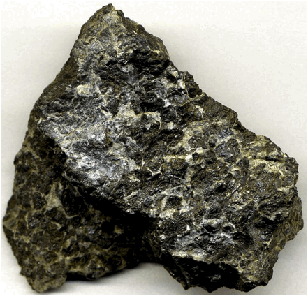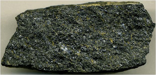 Olivine chromitite (7.3 cm across), composed of chromite (metallic