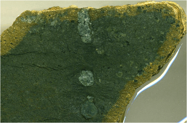 Chromitic talcose serpentinite (6.4 cm across), originally a ~basal crustal dunite