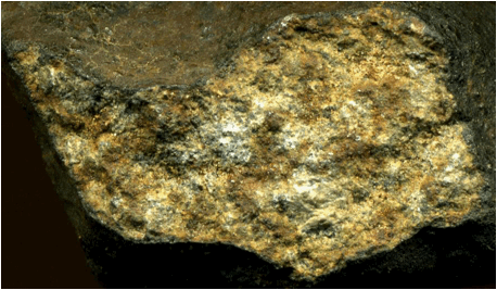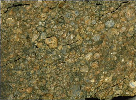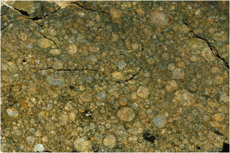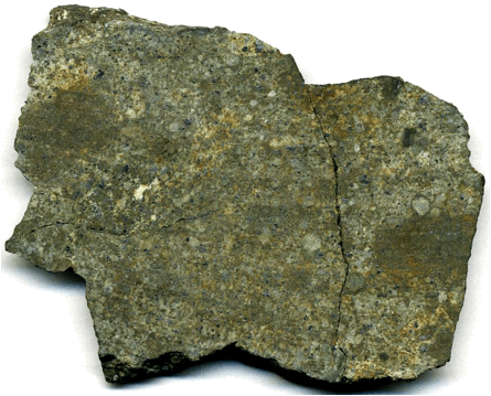 chondrules are indiscernible). It consists of light-colored clasts in a