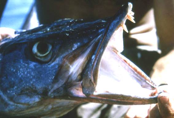 closeup of teeth of great barracuda from unrecorded locality in the Bahamas.