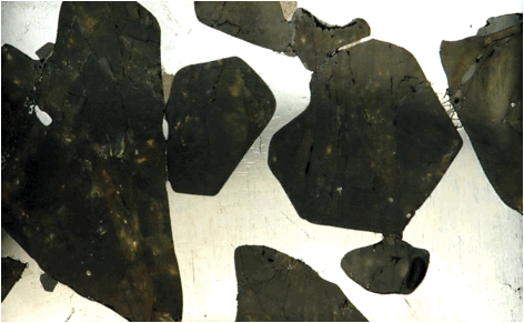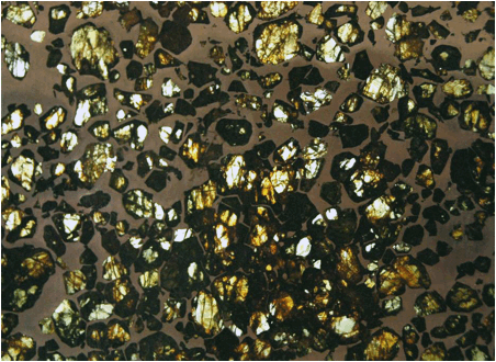 transparency. The black areas are metallic iron-nickel (Fe-Ni).