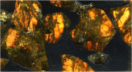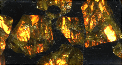 greenish), which is a ferromagnesian silicate mineral. Backlit pallasite