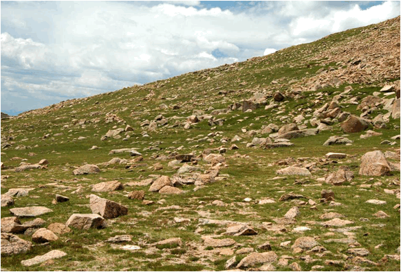 Pikes Peak Batholith (looking ~ESE) - 1.08 b.y. coarsely-crystalline,