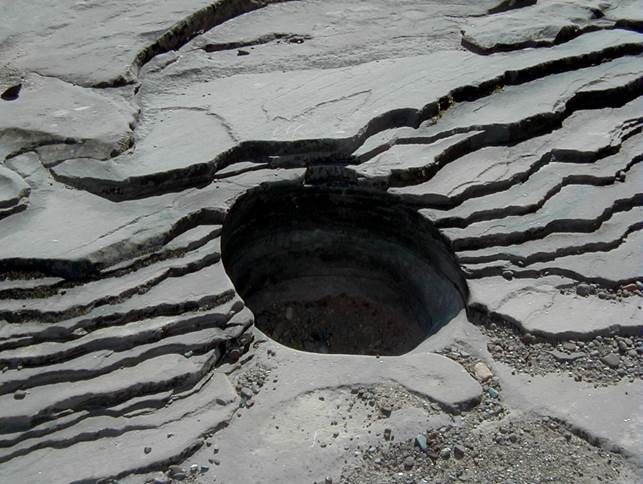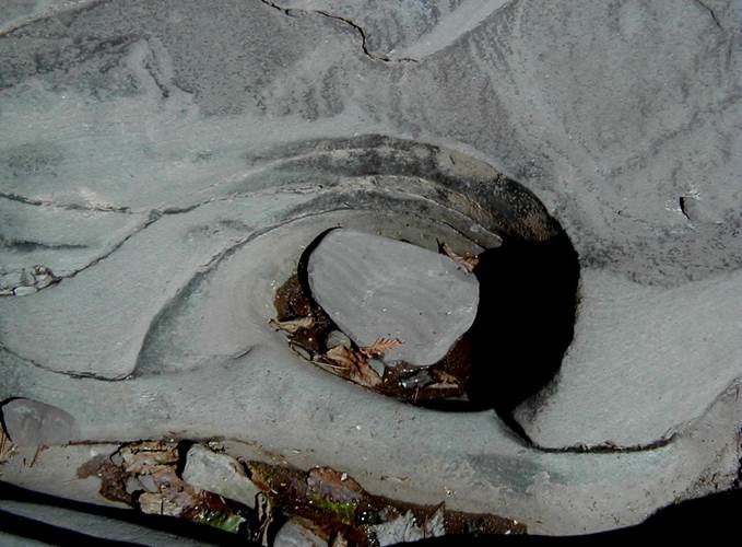 enlarge by abrasive grinding action as debris gets swirled around by rushing