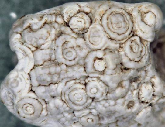 Beekite rings on a the surface of a silicified solitary rugose coral (Devonian,