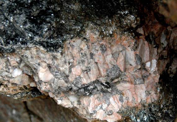 Mesoproterozoic, 1.42 b.y.). The host rock is the dark, sparkly material