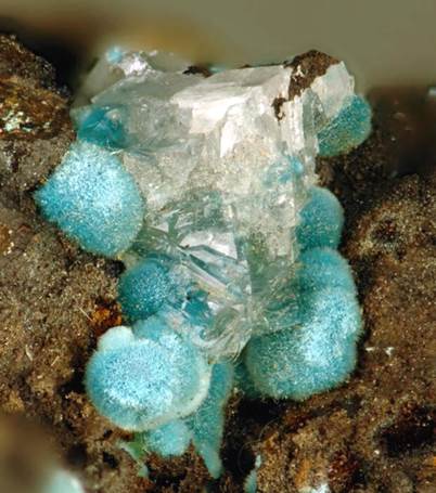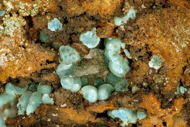 clusters (pale blue) on iron hydroxy-oxide gossan matrix (field of view ~3.5 cm