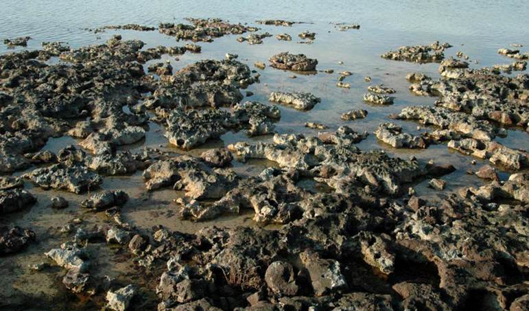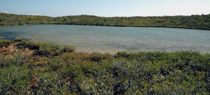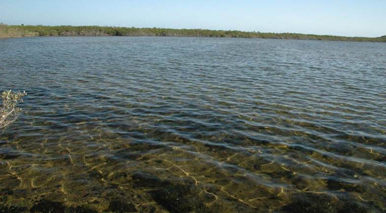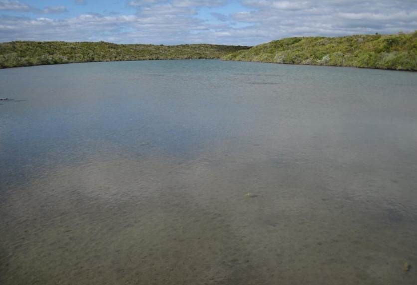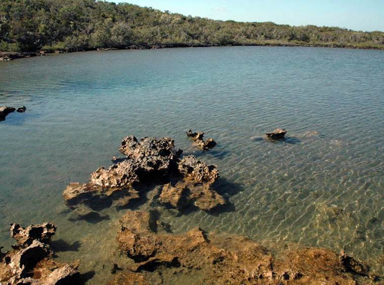 a “swiss-cheese limestone” rocky shoreline. The water’s salinity is