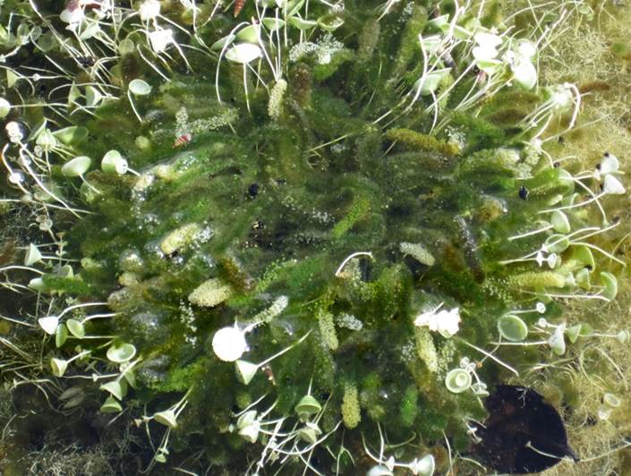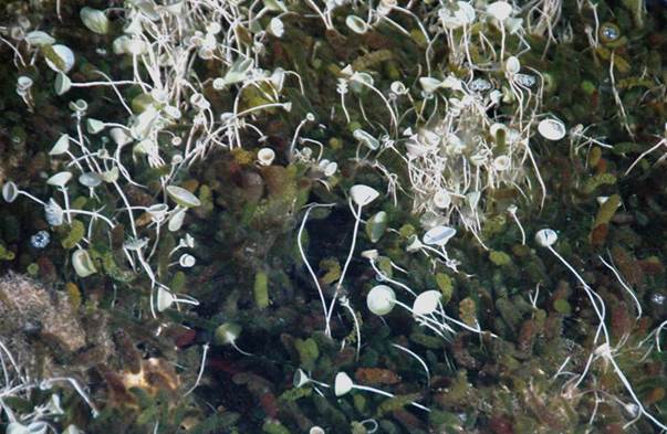 Batophora oerstedi Agardh, 1854 (= dark green fuzzy structures) & Acetabularia