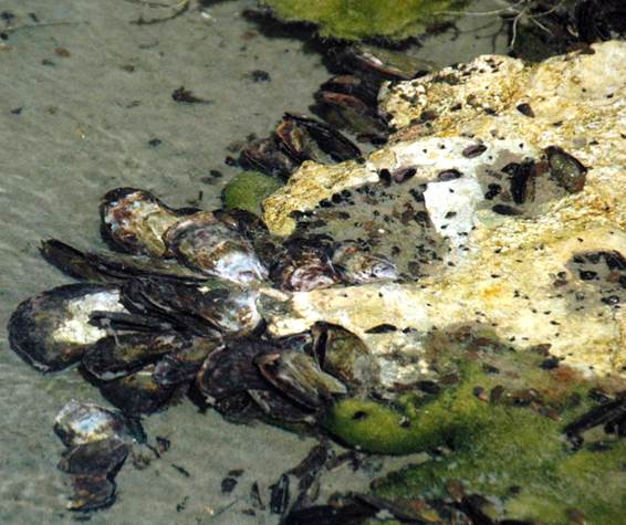 encrusting Crescent Pond’s shoreline rocks here are mangrove oysters (Animalia,